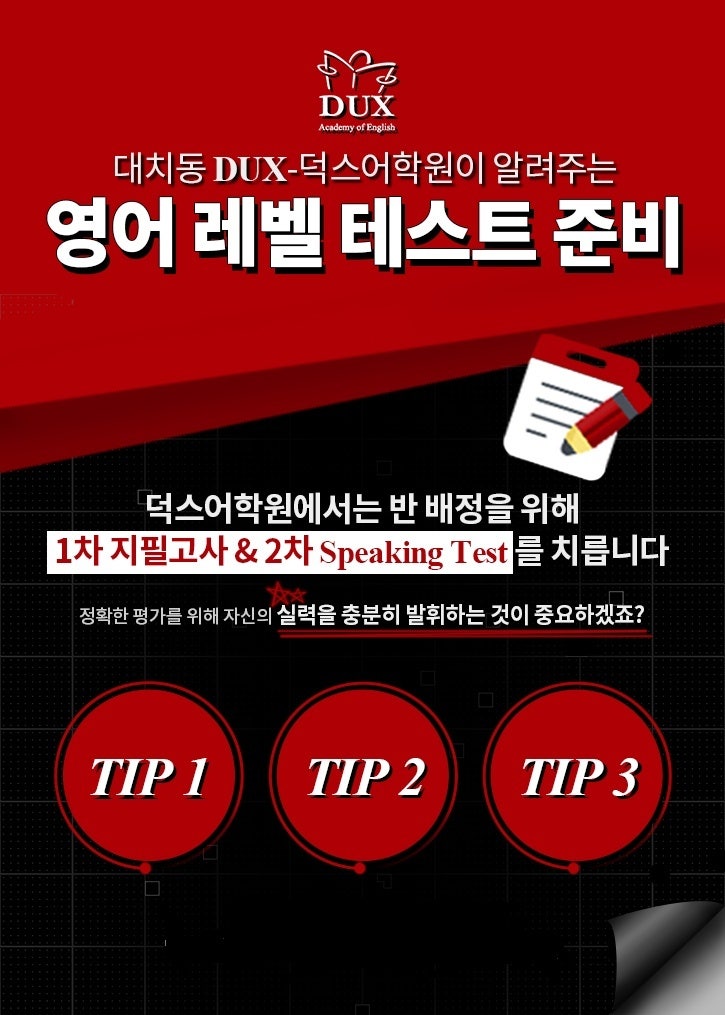 안녕하세요. "최상위 1%를 위한 읽고, 생각하고, 쓰는 힘까지 키우는 영어" DUX 덕스어학원입니다. https://sb.dux.ac/SUD0/homepage/SEA2_LevelTest/LvExam_List.asp 입학테스트 신청은 홈페이지 접속~! 문의: 010-5581-3315 #덕스어학원 #DUX어학원 #입학테스트 #레벨테스트 #영어레벨테스트 #초등영어 #중등영어 #영어학원추천 #대치동영어학원 #입학설명회 #스피킹테스트 #리딩학원 #라이팅학원 #영어실력향상 #반배정테스트 #영어공부습관 #학부모안내 #신입생모집 #대치동덕스 #영어교육전문 #성북 덕스어학원 <img src="https://blogthumb.pstatic.net/MjAyNjA0MTlfNTkg/MDAxNzc2NTg3NTM3Mjcz.44ioC-Zi79t2Jq7HsTYY3VMu8uXukSTkKIvDyasYq3sg.Gd0z6sx5Xu4bwF-5UE_-mf1NZeeToO2rpQj-oE_mtAUg.JPEG/KakaoTalk_20241022_210809942.jpg?type=s3" />