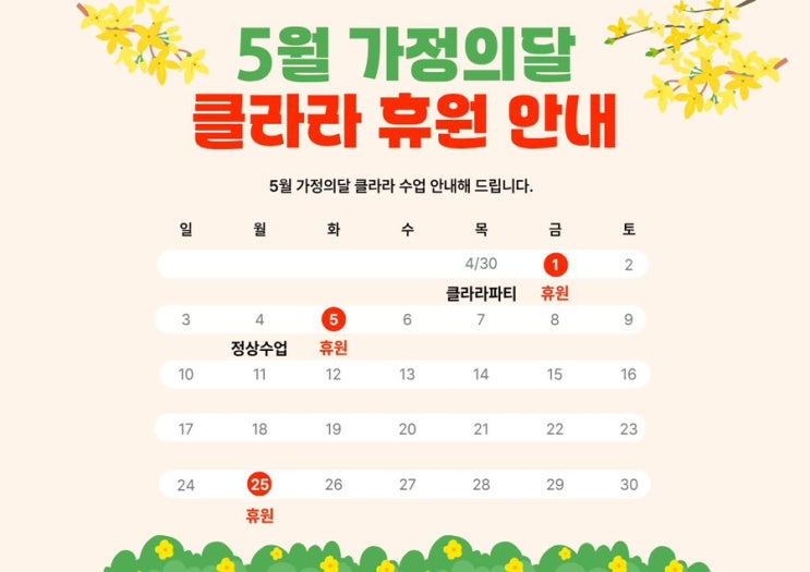 5월 가정의달 휴원 안내입니다 참고해 주세요 ◡̈ 감사합니다 #5월 #가정의달 #다산클라라음악학원 <img src="https://blogthumb.pstatic.net/MjAyNjA0MjZfMjAg/MDAxNzc3MjA4NDgwNTQx.gZZKVEs3cal5sgk82_peMTwW4VcF5im8y5VTqVjd1cMg.njJ9nka0MtUaw8WrkcOal7elSauwkMwMp_JofzFnjocg.JPEG/IMG%A3%DF5425.JPG?type=s3" />