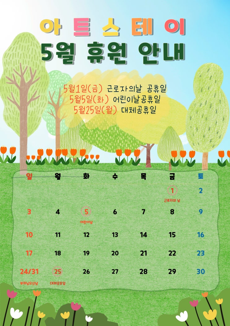 안녕하세요. 아트스테이입니다. 가정의달 5월! 아트스테이의 휴원일을 안내드립니다. 5월 1일(금) 근로자의 날 공휴일 휴원 5월 5일 (화) 어린이날 공휴일 휴원 5월 25일 (월) 대체공휴일 휴원 *일정 참고하시어 수강에 착오 없으시길 바랍니다~ 건강하고 행복한 5월 보내세요~ 오늘도 행복한 아트스테이! 예술가를 키우는 아트스테이 25년 아트스테이 새학기 시간표는 아래 링크를 통해서 확인하실 수 있습니다. 춤에 대한 진심 오늘도 전국 4개지점 아트스테이와 함께해요! 아트스테이 발레무용원 청주본점(성화원) 0432338848 청주분점(지웰원) 0432318848 서울점(광나루원), 경기부천점(소사원) ☑️ 순수무용 기초트레이....... <img src="https://blogthumb.pstatic.net/MjAyNjA0MjBfMjYg/MDAxNzc2Njc3ODAxMTIx.euGrk-9iIPgqSujWzqVGt_l1wnmFURvcxtz_RMajVx4g.Qn_YmpcTiyfHFywfKifyfKD61Kfk-8JWETamiBDqOocg.JPEG/2025-5%BF%F9%C8%DE%BF%F8-001_%281%29.jpg?type=s3" />