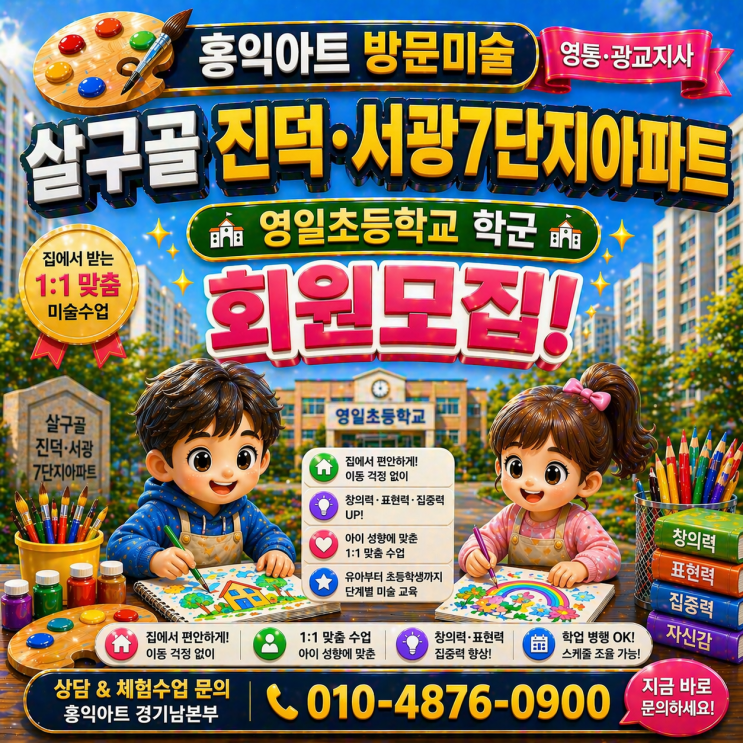 안녕하세요. 홍익아트 방문미술 영통·광교지사입니다. 최근 살구골 진덕·서광7단지아파트 학부모님들께서 방문미술 상담 문의를 꾸준히 주고 계십니다. 특히 영일초등학교 학군은 교육 관심도가 높고 자녀 교육에 적극적인 가정이 많아 방문미술 수업 문의도 지속적으로 증가하고 있습니다. 이런 고민 있으신가요? “아이 미술학원 보내야 할까요?” “집에서 편하게 수업 받을 수 없을까요?” “창의력과 집중력을 키워주고 싶어요” “우리 아이 성향에 맞는 수업이 필요해요” 그래서 요즘은 집으로 찾아가는 방문미술을 선택하시는 부모님들이 많습니다. 왜 방문미술일까요? ✔ 집에서 편안하게 수업 가능 ✔ 이동....... <img src="https://blogthumb.pstatic.net/MjAyNjA0MjVfNDEg/MDAxNzc3MDc3ODQxOTI1.eMtmkXiH1AiIJu6vN-9OdZkqrkUX9loxJ-RkU1gn8sgg.yIvbLLRxHLv8iYP-tFqwEcHRBt40KIy0zEBkbYW92qUg.PNG/%BB%EC%B1%B8%C1%F8%B4%F6%BC%AD%B1%A4.png?type=s3" />