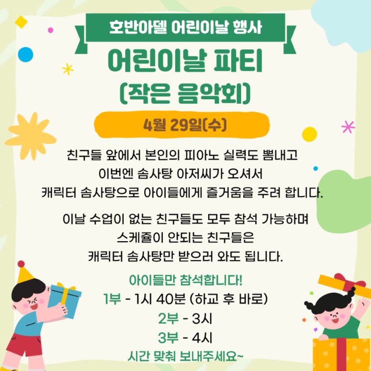 내일은 우리 호반아델음악학원에서 특별한 하루가 기다리고 있어요 바로 어린이날을 맞이해서 즐거운 파티를 준비했답니다! 신나는 분위기 속에서 친구들과 함께 웃고 즐길 수 있는 시간을 만들 예정이에요. 특히 이번에는 더 특별한 이벤트가 준비되어 있는데요! 바로바로~ ✨ 솜사탕 아저씨가 학원에 방문하신답니다! ✨ 아이들 눈앞에서 직접 만들어지는 알록달록한 솜사탕을 보며, 달콤한 추억을 쌓을 수 있을 거예요. 보기만 해도 기분 좋아지는 솜사탕처럼, 아이들의 하루도 달콤하게 채워지길 기대해봅니다 피아노도 배우고, 친구들과 함께 즐거운 시간도 보내는 우리 아이들! 내일 하루는 더 많이 웃고, 더 많이 행복해지는 시....... <img src="https://blogthumb.pstatic.net/MjAyNjA0MjhfMjc5/MDAxNzc3MzY4MDgwMjky.8jg2z5A1n6Iod8ju4P9E-XYoAFa2i36uT4XP-lYMPwMg.FSJeQ3Zo6DaAFyWfx4RTr50kxJBnpJ4cSZYN7n3LidMg.PNG/900_1777367360954.png?type=s3" />