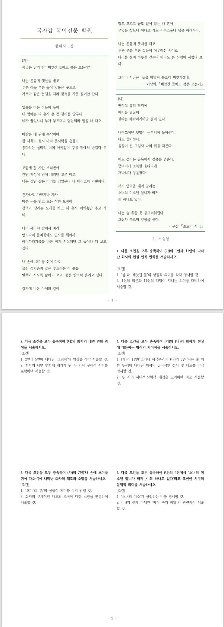 울산외고 국어 전문 - 국자감 국어전문 학원 / 외고 3학년을 위한 서술형 문제
