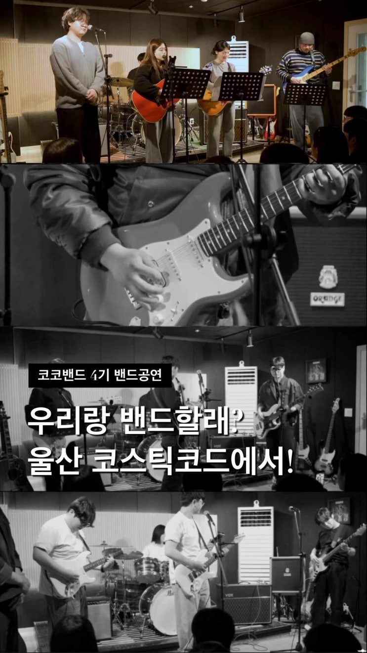 안녕하세요 울산 음악학원 & 기타학원 코스틱코드입니다! 드디어 코스틱코드 4기 합주공연이 진행됐어요! 이번에는 정말… 퀄리티가 확 올라가서 보는 재미도, 연주하는 재미도 모두 최고였던 공연이었어요. 끝나자마자 다들 “5기는 언제 해요?” 할 정도로 여운이 엄청났답니다! 이번 공연은 영상도 많이 남겨놨는데요! 이렇게 열정적이었던 순간들을 사진과 영상으로나마 전달드릴 수 있어서 너무 다행이에요 :) 그래도 역시… 현장에서 느껴지는 그 분위기까지는 다 담기지 않아서 조금 아쉽기도 하네요! 요즘 코스틱코드 밴드합주가 재밌다고 울산에서도 소문이 나면서 취미음악 시작해보시려는 분들의 문의도 정말 많아졌어요! 무료체....... <img src="https://phinf.pstatic.net/image.nmv/blog_2026_04_20_400/kpwzlSFaXA_03.jpg?type=f480x480" />