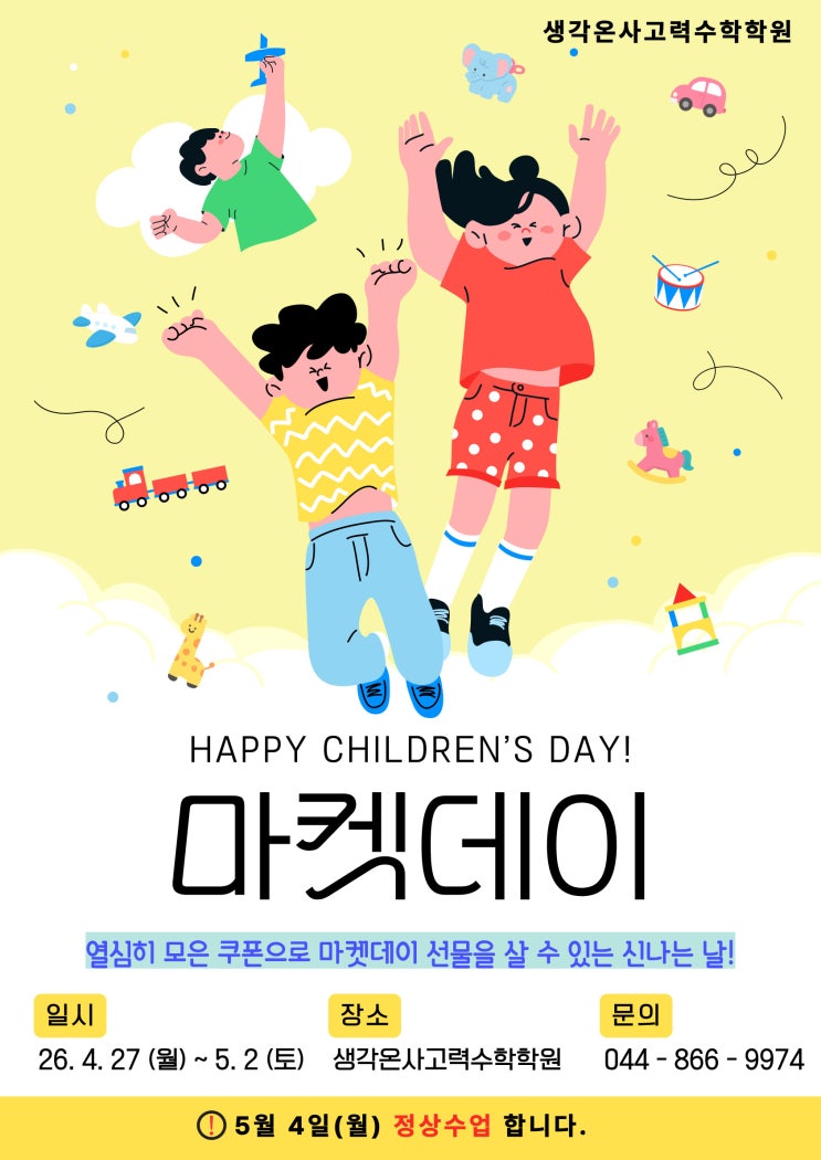 날씨가 정말 따뜻해졌네요 따뜻한 날씨에 돌아온 마켓데이!!!! 어린이날을 맞이하여 생각온사고력수학학원에서는 마켓데이를 개최합니다. 친구들이 제일 많이 기다리는 행사이기도 하죠~~ " 생각온사고력수학학원 마.켓.데.이 " 일시 26년 4월 27일 (월요일)~ 5월 2일 (토요일) 열심히 모은 쿠폰으로 선물도 사고 재미있는 게임도 즐겨요~!!!!!! <img src="https://blogthumb.pstatic.net/MjAyNjA0MjFfNTEg/MDAxNzc2NzQ5NjA3Njg2.3k-MqKgW5y-ibYzVJNejrx2YFd2E5TdGwvjpKn3OtRUg.DxalvMNU_Y4vPQjxAzqqCIbK9QRHw7hxbY0SxJ3siqsg.JPEG/%C1%A6%B8%F1%C0%BB_%C0%D4%B7%C2%C7%D8%C1%D6%BC%BC%BF%E4._%2846%29.jpg?type=s3" />