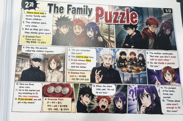 소식이 뜸했네요. 수행평가가 한차례 휘몰아치고, 오늘은 원장의 직전보강이 있었습니다. 아침부터 제 시간에 착착 도착하는 아이들을 위해 준비한 자료가 오늘은 더욱 빛나는 날이었어요. 우리 중딩이들, 들고 다니면서 본문 계속 읽으라고 핸디사이즈로 제작한 만화책입니다. 만화를 보며 주요 부분 다시 확인했어요. 캐릭터를 헷갈려해서 그림으로 캐릭터를 살려 놓았더니, 문제를 푸는데 그림을 같이 떠올리는 효과가 탁월합니다. 문법은 영어학원장들의 메카인 강한영어학원만들기의 금손 원장님들 도움으로 직보 자료를 만들었습니다. 속에는 시험에 나올 문장과 문형 훈련 자료가 꽉꽉 들어차 있었어요. 서술형 문제를 유형별로 정리하여....... <img src="https://blogthumb.pstatic.net/MjAyNjA0MjVfNCAg/MDAxNzc3MDQ1NzQ2MzY5.fw4PjSG76DQ4qFXKAtT3quG_t6Wt8u7JhLOuRinmoS4g.j6XVzRw5gcdOs5z6LoMCgk64JVXqwtp6Q5vybFeIO44g.JPEG/output%A3%DF2005942827.jpg?type=s3" />