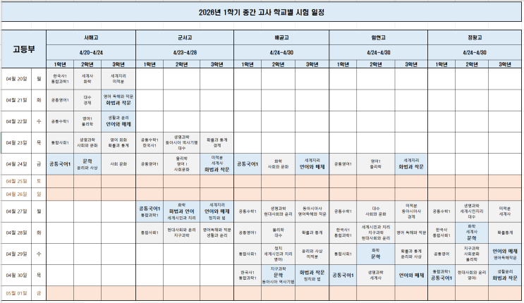 중간고사 고등부 학교별 시험 일정표 고등부 1학기 중간고사 시즌이 시작되었습니다. 이번 중간고사는 5월 1일 노동절 공휴일 지정에 따라 일정이 조정된 덕에 '짧고 굵게' 가는 시즌이 되겠네요. 고1부터 고3까지 한 명 한 명 잘 챙겨서 좋은 점수 나왔으면 합니다. 겨울 학기 시즌의 노력을 좋은 결실로 마무리하고 다시 찾아 뵙겠습니다. 신규 등록은 시험 종료되는 4월 30일 이후 문의 및 등록 가능합니다. 등록은 비대면 등록도 가능하므로, 부담없이 연락주시면 됩니다. 중2, 중3 배곧중 중간고사도 열일 중입니다. 배곧중 중간고사에 국어도 포함된 관계로, 중2, 중3 배곧중 학생들도 열공 중입니다. 중간고사 종료 후 중3은 학....... <img src="https://blogthumb.pstatic.net/MjAyNjA0MjFfMjk5/MDAxNzc2NzczNTYxMDI0.ZQGp2rVz1lPuwc-1StLL3nEgfJCH0GKZ3EjHoUyWcYIg.8zyLJ3L0I0ByweVQ6pSmbKJchL81Jh9CckwLoQm7Dgcg.PNG/2026-04-21_21_12_00.png?type=s3" />