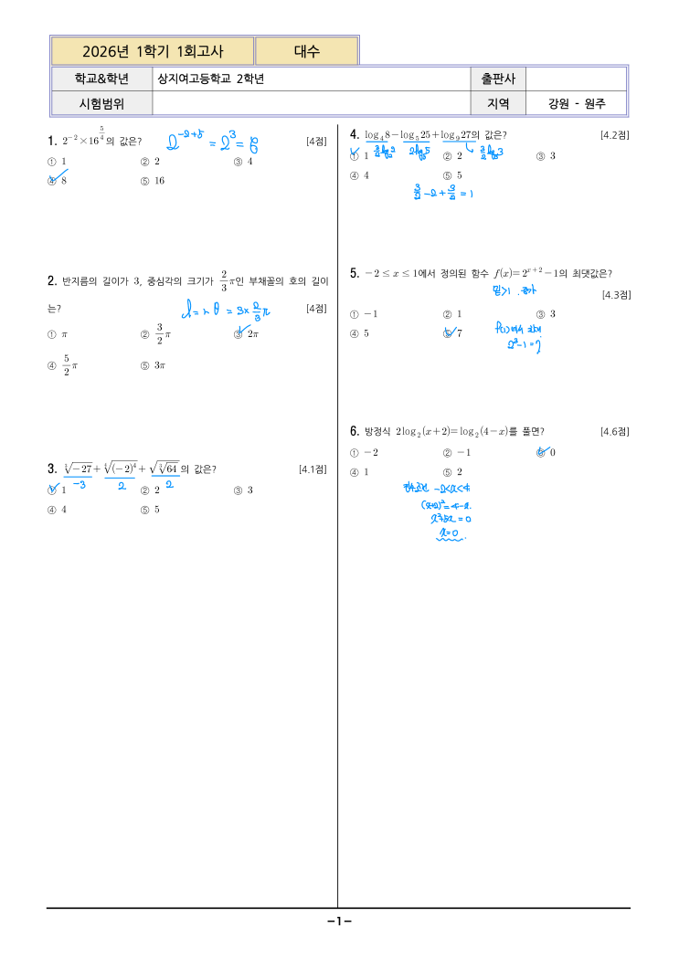 26년 상지여고2-1 대수 1회고사 손풀이