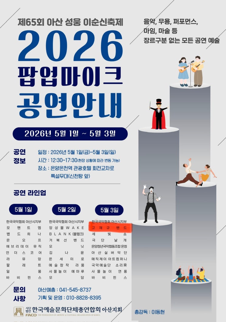 안녕하세요~뮤직스토리 실용음악학원입니다~~ 이번 이순신 축제때 고재규밴드가 팝업마이크에 선정되서 공연을 합니다~~ 정말 감사합니다~~ 5월 3일 일요일 오후 1시 30분에 이순신축체 팝업마이크 세트장으로 오시면됩니다~~ 장소는 신천탕 앞쪽으로 될꺼같아요~~ 즐거운 공연 준비해보겠습니다~~ 감사합니다~~ <img src="https://blogthumb.pstatic.net/MjAyNjA0MjBfMjA3/MDAxNzc2Njc5NTgzMTk2.u-6_YnXyXqYygLqvbjbx6P17KIoekaynQ447ISe_lHog.1DjbS3rCduc4rnJGa6n8ubh3bN1Ok0euFSE5MyKvNUkg.JPEG/%C6%CB%BE%F7%B8%B6%C0%CC%C5%A9.jpg?type=s3" />