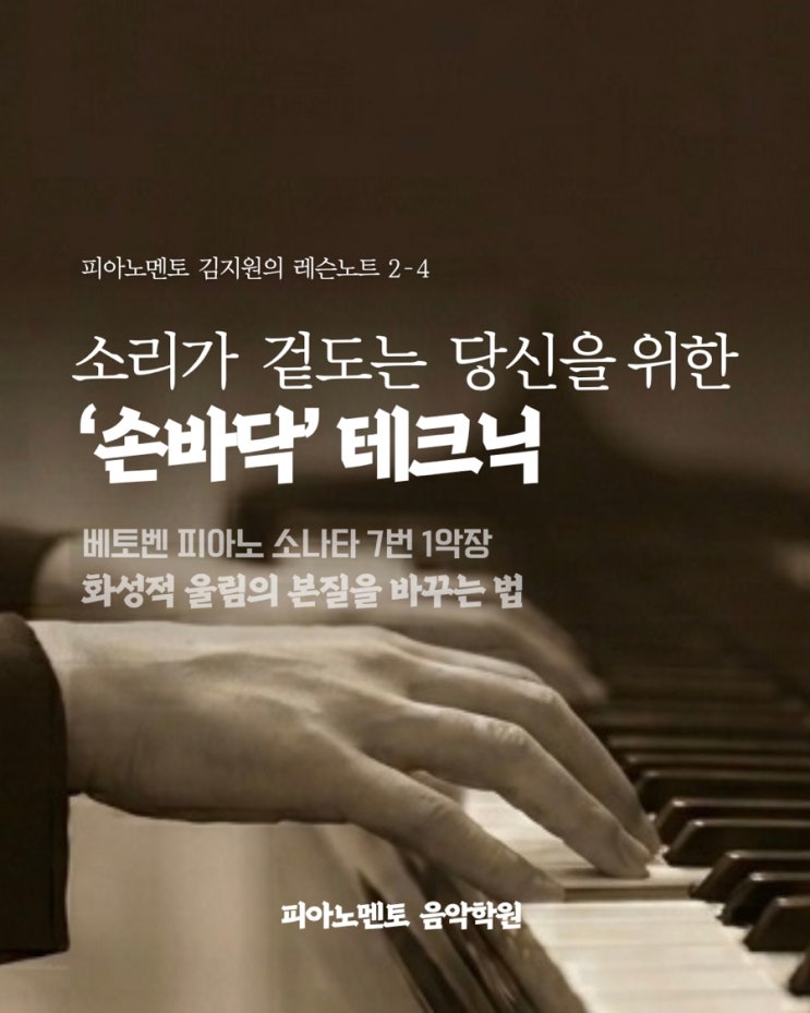 안녕하세요. 피아노멘토 원장 김지원입니다. 지난 글에서는 악상기호가 단순한 번역이 아니라, 곡의 이미지와 분위기를 읽는 중요한 단서라는 이야기를 나누었습니다. ⬇️ 지난글 보러가기 : 수비토 피아노 정복하기 오늘은 그 분위기를 실제 소리로 표현하기 위한 테크닉에 대해 이야기해보려 합니다. 악보대로 정확히 연주했는데도 어딘가 소리가 건조하고, 음악이 살아나지 않는 느낌을 받은 적 있으신가요? 그 이유는 손가락이 아니라, 의외로 손바닥의 역할에 있을 수 있습니다. 이번 글에서는 베토벤 피아노 소나타 7번 1악장을 예로 들어, 화성적 울림을 바꾸는 손바닥 테크닉과 에너지 전달의 핵심 개념을 정리해봅니다. 소리가 겉도는....... <img src="https://blogthumb.pstatic.net/MjAyNjA0MjlfMTcx/MDAxNzc3NDI4Mzk0ODkx.yUBWuYzl3OLobtgguEoYZVRyPM2iISFSdo-x4T0zGi4g.xyyTq3BOnJ5hW1KuFxtM6upIkAOfQy_x3QWx14zI7XQg.JPEG/%C4%AB%B5%E5%B4%BA%BD%BA_%A3%AD_%BC%D5%B9%D9%B4%DA_%C5%D7%C5%A9%B4%D0.jpg?type=s3" />