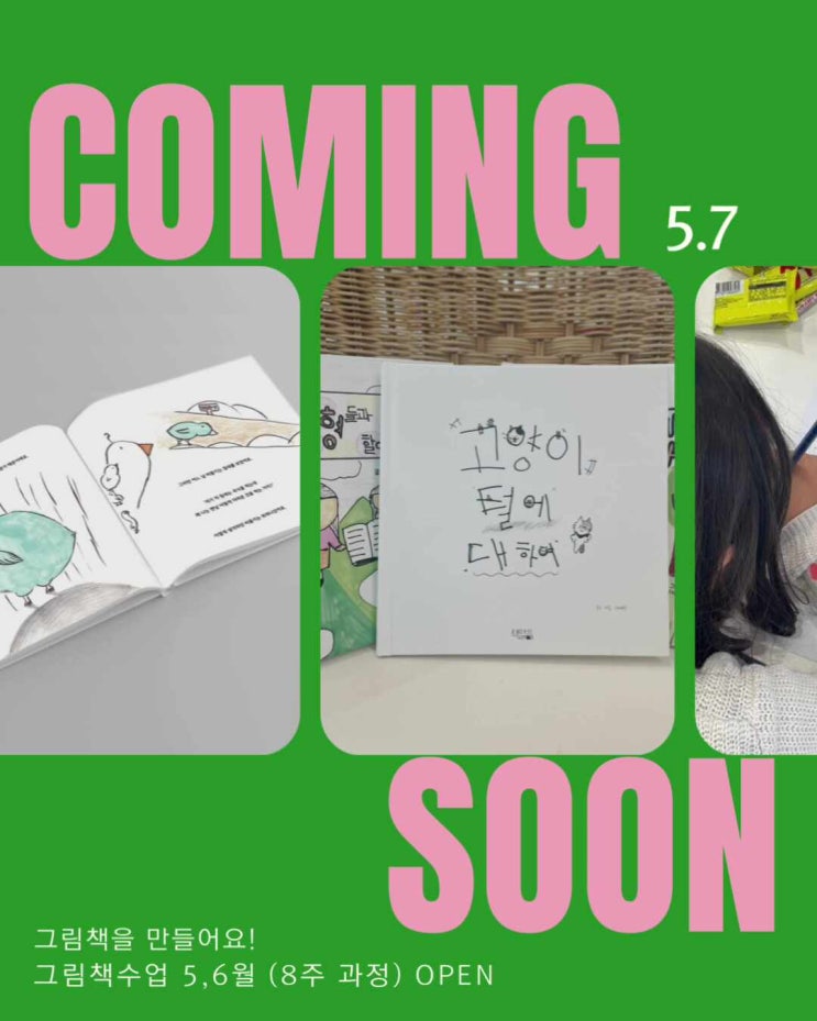 나의 글과 그림으로 20페이지 양장본(하드 커버, 작가명 표지 인쇄) 그림책 한 권을 만들어요! 1. 대상 : 초등학생 (초1 ~ 6) - 글 또는 그림에 관심이 있는 학생 - 작가가 되어 책을 만들어 보고 싶은 학생 - 하나의 결과물로 완성해보는 경험이 필요한 학생 2. 정원: 4명 3. 수업 세부 사항 1) 일정: 목 오후 2:30-4:00 * 시간 조정 문의는 별도 연락 바랍니다. 2) 수업 시간, 수업료, 내용 - 1회 90분, 주 1회 8주 - 총 8회 수업 (책 1권 포함) : 36만원 *차기 수업부터 38만원으로 인상됩니다. *책 추가 주문시 1권당 30,000원 > 1단계. 워크시트를 활용한 프레임 워크로 이야기 구성하기(1~2회) >2단계. 그림 그리기와 글쓰기(6~9....... <img src="https://phinf.pstatic.net/image.nmv/blog_2026_04_16_3051/EG3DZpwYJe_03.jpg?type=f480x480" />