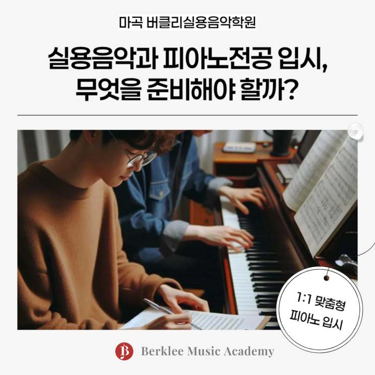 Play Your Dream, Sing Your Future! 안녕하세요. 마곡에 위치한 버클리실용음악학원입니다. 오늘은 많은 학생들과 학부모님들이 궁금해하시는 실용음악과 피아노전공 입시 준비 방법에 대해 이야기해보려고 합니다. 실용음악과 피아노전공, 무엇을 배우나요? 실용음악과에서의 피아노전공은 클래식 피아노와는 다르게, 보다 다양한 장르를 기반으로 한 연주와 창작 능력을 중요하게 평가합니다. 재즈, 팝, R&B, 펑크 등 여러 스타일을 이해하고 표현하는 것이 핵심이며, 단순한 연주 실력뿐만 아니라 즉흥연주(애드립), 코드 해석 능력, 리듬감 등이 중요한 요소로 작용합니다. 입시에서 평가하는 주요 요소 실용음악과 피아노전....... <img src="https://blogthumb.pstatic.net/MjAyNjA0MTRfMTMz/MDAxNzc2MTE4NzUyNDg2.V8xI4iO3xe6PS6135c9HUy56vKZLuvkMm0CS4nk813wg.DScAajtwM_U19dyjPs8YAO7azk5K10-BD9ojRYUE-_Yg.PNG/%B8%B6%B0%EE_%B9%F6%C5%AC%B8%AE_%BD%C7%BF%EB%C0%BD%BE%C7%C7%D0%BF%F8-001.png?type=s3" />