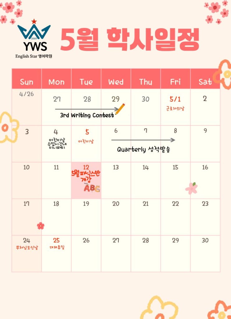 안녕하세요! 공진초 아이들의 영어 자신감을 책임지는 YWS 예우선 잉글리시스타입니다. ^^ 다가오는 5월의 설레는 소식들과 함께, 지금 우리 아이들이 뜨겁게 준비하고 있는 '특별한 도전' 소식을 먼저 전해드립니다. ✍️ 제3회 원어민 라이팅 컨테스트 (4/27 ~ 4/29) 지금 YWS의 열기는 그 어느 때보다 뜨겁습니다! 바로 원어민 선생님과 함께 준비하는 라이팅 컨테스트 때문인데요. 일정: 4월 27일(월) ~ 4월 29일(수) 내용: 우리 아이들이 스스로 문장을 구성하고 자신의 생각을 영어로 표현하는 시간입니다. 포인트: 원어민 선생님의 세심한 가이드와 피드백을 통해 단순한 암기가 아닌, 실질적인 'output'을 만들어내....... <img src="https://blogthumb.pstatic.net/MjAyNjA0MTVfMjkx/MDAxNzc2MjQxOTc4ODUy.jADL_E1gi0hzBF1NRWTHRgmewIhrnx_yBsabc_G7-4Ag.V0nHI-GkctFeXuF3R5p4XQvOM3x9brZ8RvBIceK6NjUg.JPEG/2605.jpg?type=s3" />
