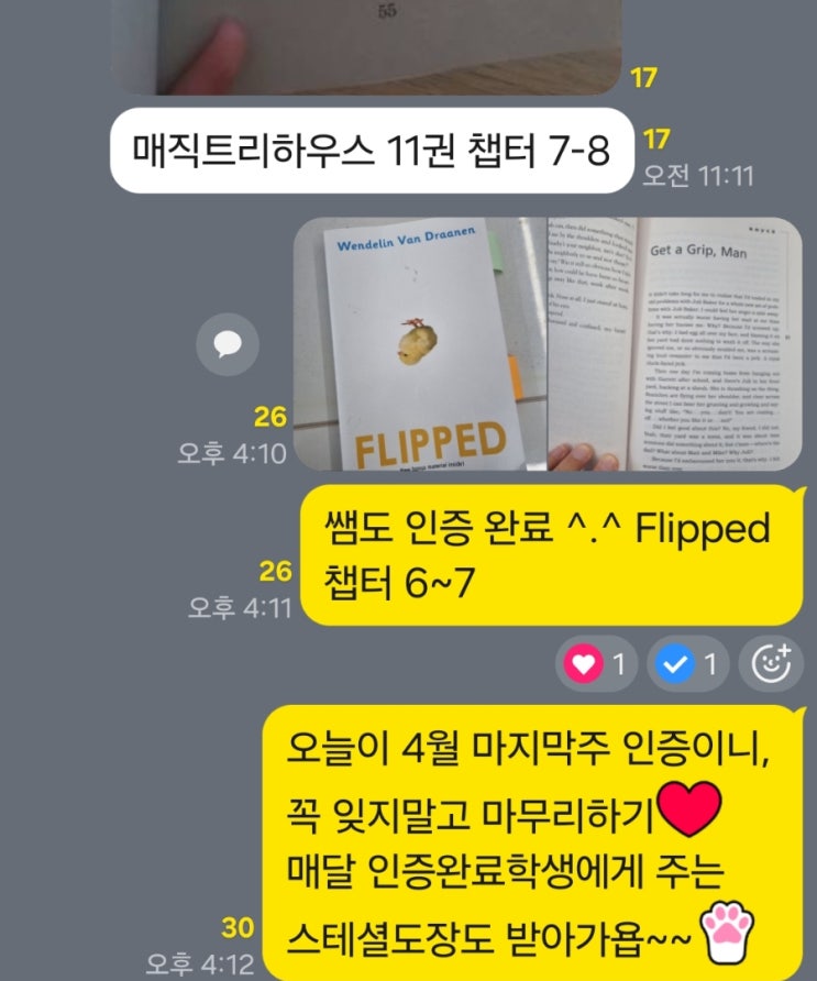 작년부터 꾸준히 해오고있는 원서읽기 인증방 운영 블로그에도 아카이빙으로 기록해놓으면 좋을것 같아 카테고리 신설! ㅎㅎ 학원에서뿐만 아니라 집에서도, 주말에 조금이라도 시간내어 원서를 읽는 습관을 만들어주고 싶어서 시작한 원서읽기 카톡인증방 : ) 매주 잊지않고 꾸준히 해오고 있는 학생들이 넘 기특하다 ^^ 아래는 인증사진 몇 장만~ 나도 다음 원서 수업으로 준비 중인 Flipped 원서 읽기 인증완료 ~ 그 앞장에는 줄도 쳐놨는데 인증은 깨끗한 페이지로 했다 ㅎㅎ 곧 온갖 표시가 생길 예정 쌤 인증에 하트, 확인표시 눌러준 아이들 넘 귀엽다 (!) <img src="https://blogthumb.pstatic.net/MjAyNjA0MjZfMTUg/MDAxNzc3MTg5MjY5ODM5.sqqrzUggybAJz10FXaqXHszzhM6LfuMgbGn64SNVmdAg.hRtX4RFGspalXr3jdscVwSByhjBaELVH0bf404lGwv8g.JPEG/900_Screenshot_20260426_161304_KakaoTalk.jpg?type=s3" />