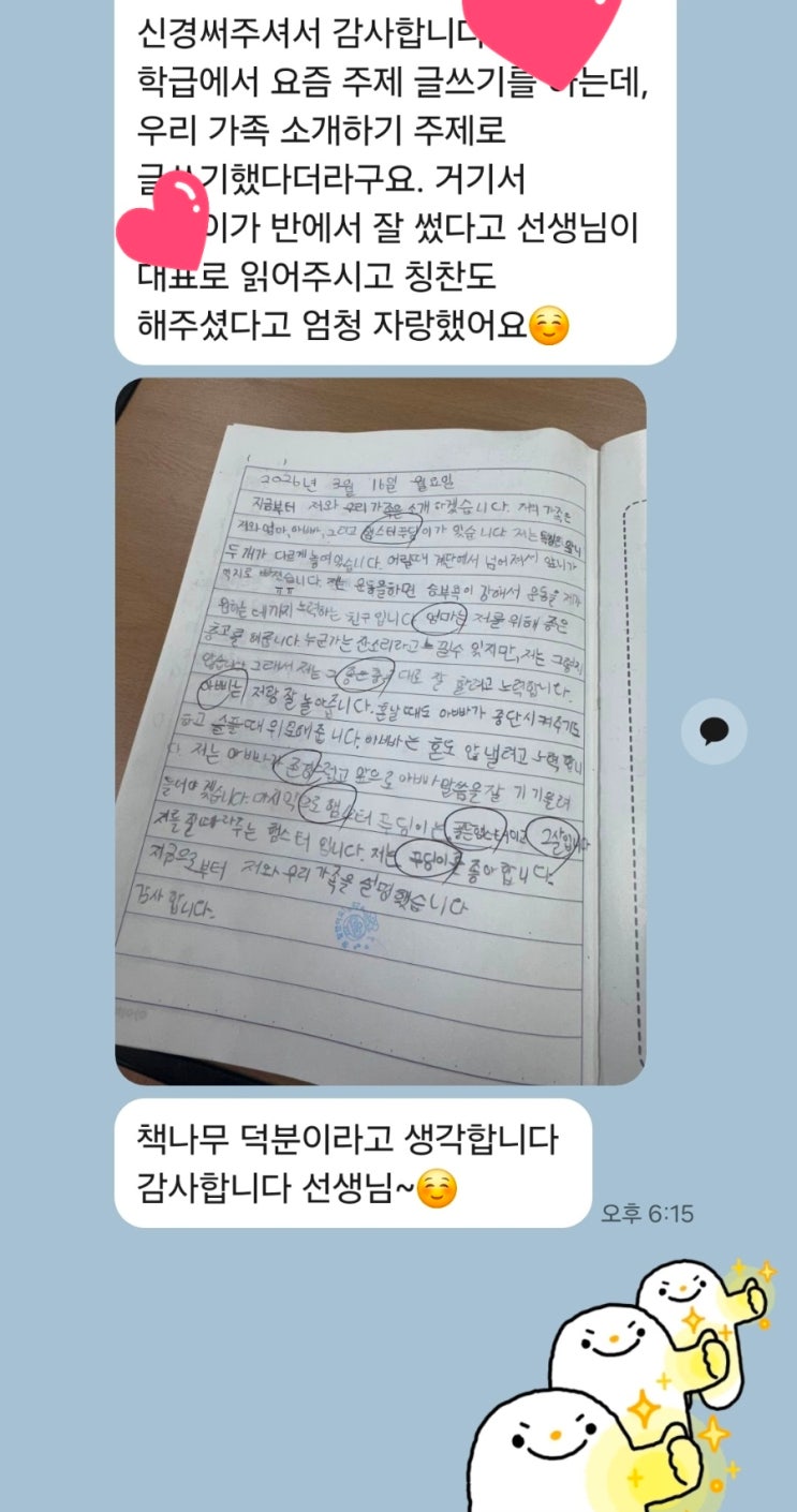 아이를 학원에 보내는 부모님의 마음은 늘 같습니다. "우리 아이가 잘 적응할까?" "책을 좋아하게 될까?" "정말 도움이 될까?" 책나무에 처음 상담 오시는 학부모님들도 가장 많이 하시는 질문이 바로 이런 부분입니다. 그리고 시간이 지나면서 제가 감사하게 생각하는 순간은, 아이의 변화를 가까이에서 지켜보신 학부모님들께서 직접 기쁜 소식을 전해주실 때입니다. 실제로 책나무 학부모님들께서는 아이의 변화와 성장을 문자나 통화로 자주 나누어 주십니다. "처음에는 재미없을 줄 알았는데 다녀보니 정말 재미있다고 해요." "학교에서 글쓰기기를 잘했다고 선생님께 칭찬받았어요" &qu....... <img src="https://blogthumb.pstatic.net/MjAyNjA0MTJfMTU4/MDAxNzc1OTgwNzIxMzgx.aDfEGJtrYxvZR19lalhMqUpjkkMWwoP3k7sAyJAjNaMg.oYxh3ii1v5cU7rt8hsyIWFjZo73xDzj1liBIsXipRjog.JPEG/900_Screenshot_20260412_145633_KakaoTalk.jpg?type=s3" />