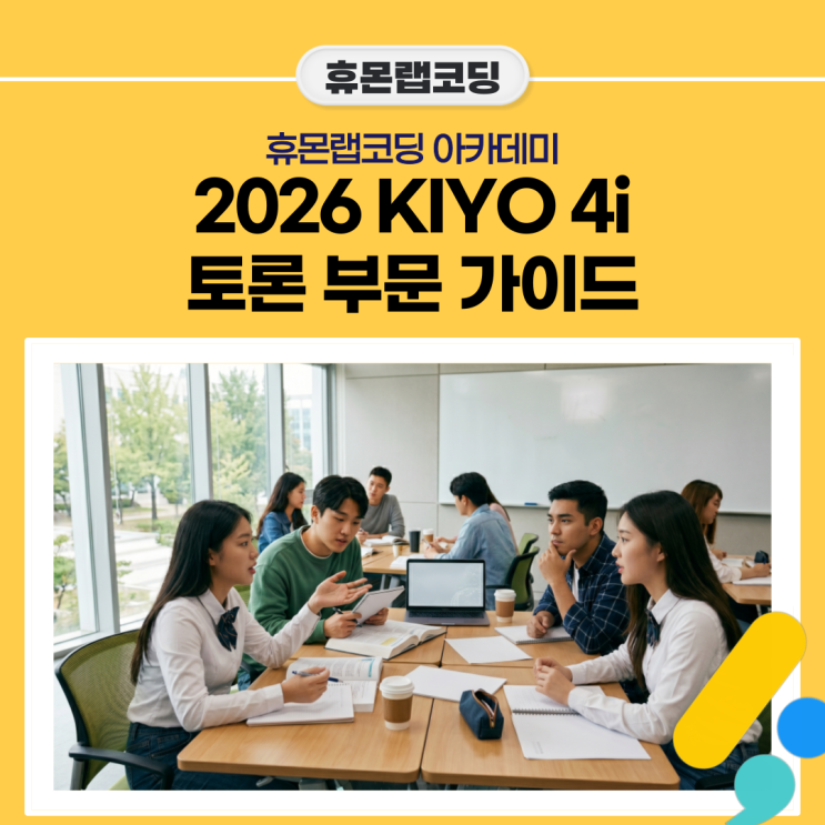 안녕하세요! 스스로 생각하는 힘을 키우는 휴몬랩코딩 아카데미 입니다. 곧 진행 예정인 키요대회(KIYO 4i)에 대한 가이드를 전달해드릴 예정입니다. 이번 부문은 논리적으로 사고하고 소통하는 능력을 겨루는 '토론' 부문에 대해 설명드리겠습니다. KIYO 4i 대회 설명 KIYO대회는 세계청소년올림피아드(Korea International Youth Olympiad)4i를 의미하며, 전 세계 청소년들이 창의력, 발명, 과학 기술 분야 역량을 육성하는 국제대회입니다. 창의성, The BBl, 어린이 그림, 토론 총 4개의 부문으로 나눠져 있습니다. KIYO 4i 토론 부문 설명 대회 주제 토론부문은 4차 산업혁명 시대의 핵심 이슈인 과학 기술의 윤리, 환경 문제, 기....... <img src="https://blogthumb.pstatic.net/MjAyNjA0MjhfMTIz/MDAxNzc3MzQxNjIxODQw.LMtli5ySkJs805UHdJ6cOqbtk4T61vSdFHpNE7pCqngg.Q9y524x4KRFtdMJ20Rza4qOh8zCeHy1qMzZwLeEJlZ0g.PNG/%BA%ED%B7%CE%B1%D7-2-011.png?type=s3" />