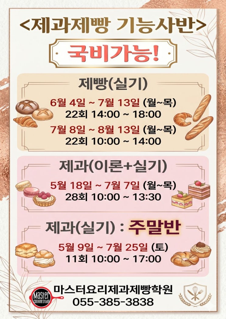제법날씨가 더워지고있는 요즘입니다! 마스터에서는 제빵오전반 수업이 한창이구요~~ 다음주월요일 부터는 제과 오후반도 개강합니다!!^_^* 베이킹 고민하고 계시다면 지금 도전하세요! 국비지원가능! 일반인도 수업가능!!! 국비지원은 고용24 홈페이지는 참고하세요~~♥ ▼▼▼▼▼▼▼▼▼▼▼▼▼▼▼▼▼▼▼▼ https://www.work24.go.kr/hr/a/a/3100/selectTracseDetl.do?tracseId=AIG20250000534292&tracseTme=4&crseTracseSe=C0061&trainstCstmrId=500020043976 저녁학생들 수업도 열기를 띄고있지용~~~~!! 세상빠르고 친절한 상담!! ☎국비.일반.학생상담문의: 055.385.3838☎ 오시는길 ▼▼▼....... <img src="https://blogthumb.pstatic.net/MjAyNjA0MjZfMTUw/MDAxNzc3MTg2NjcxOTkx.4ihXSbRwKbf6iX5qjP4jlTPfnuX1gxybkpCFoSiQbzUg.kTnZtBYANDvMFdcT0-UW-WwS69y7Qe68WH9exwhUeJ8g.JPEG/%C1%A6%B8%F1%C0%BB_%C0%D4%B7%C2%C7%D8%C1%D6%BC%BC%BF%E4._%281%29.jpg?type=s3" />