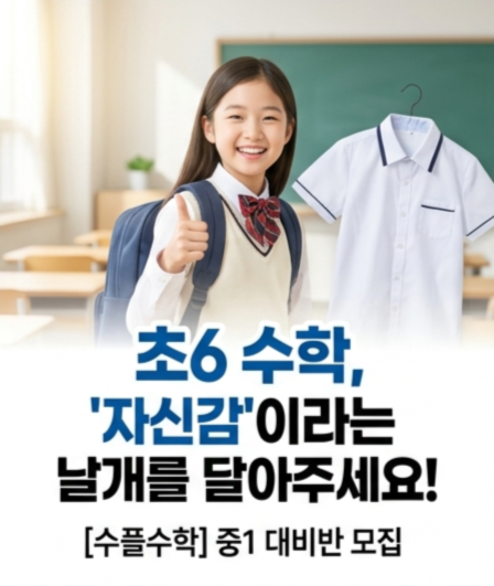 ▶ 초6 개별진도반 ▶ 초6 중등대비반 각각 모집합니다. 안녕하세요! 초등 수학과 중등 수학의 가장 큰 차이가 무엇인지 아시나요? 단순히 난이도가 올라가는 것이 아니라 '추상적인 개념'과 '논리적 서술'의 시작이라는 점입니다. 중학교에 올라가서 처음 마주하는 자유학기제와 수행평가, 그리고 갑자기 어려워지는 문자와 식... 우리 아이들이 수학을 포기하지 않도록 [수플수학]에서 '중1 대비 특별반'을 개설합니다. 이런 고민을 하고 계신가요?? 초등 수학은 잘했는데, 중등 예습은 어디서부터 해야 할지 막막하다. 연산은 빠른데 서술형 문제만 나오면 손도 못 댄다. 중학교 첫 시험(수행평가)에서 좌절하....... <img src="https://blogthumb.pstatic.net/MjAyNjA0MjhfNTMg/MDAxNzc3MzQ0OTI0MTA5.4y63AHJ2jeDtC-7UTcMHmkk6ZQo2ExKzllDu0TDp-uog.3xhw3fKrXZr8AV-p3Ekma_FouC_TKpQ3OqosKnfEOsUg.PNG/%C1%A6%B8%F1_%BE%F8%B4%C2_%B5%F0%C0%DA%C0%CE_%281%29.png?type=s3" />