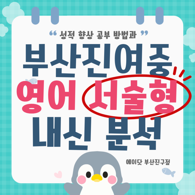 반갑습니다. 수많은 학생들의 영어 성적 향상을 만들어 내며 차별화된 방법으로 영어를 가르치고 있는 영어 성적 향상 전문가 에이닷 이주영 원장입니다. 진짜 작년 출제 유형과 동일하게 출제되었네요? 이번 부산진여중 영어 서술형 문제를 분석해 보면 작년 서술형 문제 패턴과 동일하게 출제된 것을 볼 수 있습니다. 모두 영작 문제로 출제되었고, 각 영작 문제들이 세부적으로 분류하면 '찾아 쓰기'/ '단어 배열'/ '제시된 문법을 활용하여 영작하기'로 나눌 수 있습니다. 많은 학생들이 어려워하는 부분은 '제시된 문법을 활용하여 영작하기'입니다. 어떤 문법을 적용해야 할지 조건....... <img src="https://blogthumb.pstatic.net/MjAyNjA0MjVfMzQg/MDAxNzc3MTEwOTUxOTIy.Z-6v3JaodJPQuaJyz39VmD3LECTS-l4-dG1TTFAYnJ8g.k563xVwswrnfMLPkR8wKa9rxo9aBCppkdzCVCjTd4L8g.PNG/20260425-1.png?type=s3" />