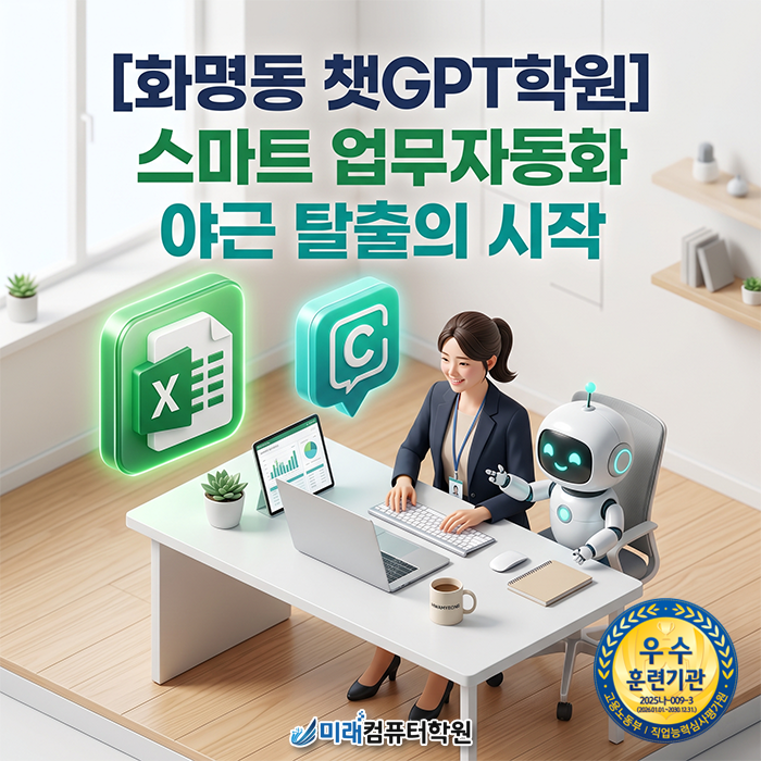 매일 반복되는 엑셀 데이터 정리와 보고서 작성, 혹시 아직도 하나하나 수동으로 입력하며 야근하고 계신가요? 일 잘하는 사람들의 진짜 비결은 '성실함'이 아니라 '자동화 능력'에 있습니다. 이제 엑셀에 AI의 지능을 더해 업무 시간을 절반으로 줄일 때입니다. 화명동에서 퇴근 후 단기에 마스터할 수 있는 화명동 챗GPT학원, 덕천미래컴퓨터학원의 스마트 업무자동화 과정을 소개합니다. 당신의 똑똑한 업무 파트너, 챗GPT란 무엇인가요? 챗GPT(ChatGPT)는 사용자의 질문에 사람처럼 답변을 생성하는 생성형 AI입니다. 단순히 대화만 하는 것을 넘어 데이터 분석, 코드 작성, 문서 요약 등 사무 업무 전반에서 놀라운 능....... <img src="https://blogthumb.pstatic.net/MjAyNjA0MjNfMjkg/MDAxNzc2OTA3Nzg0MzM4.Fr11TtW_6KN2N34Wi3WRh-WTxg9y6JSe8TgECkmIEUkg.YTQ8wV03U-iOeeVCkVdfLMevyopQDFAwj986mzs7b5wg.PNG/%BE%C6%C6%AE%BA%B8%B5%E5_1.png?type=s3" />