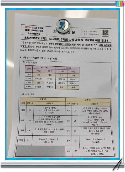2026년 1학기 이음중, 원당중, 검단가온중 1학기 중간고사 일정 및 시험위범 안내해드려요!! 이음중 일정 및 시험범위 원당중 일정 및 시험범위 검단가온중 일정 및 시험범위 2026년 첫번째 시험인 만큼 이번 중간고사에 좋은 결과 있길 바래요^^ 모두 화이팅⌒∪⌒ 궁금한 부분이 있으시면 빅뱅영수학원으로 연락주세요~~ 테스트와 상담은 예약제로 진행됩니다. (주말 테스트도 가능해용‼️) (최근 포스팅한 내용이 궁금하시면 아래 링크를 통해 확인해보세요!!) https://blog.naver.com/supower2021/224233519040 #중간고사##중간고사시험범위#중간고사일정#시험범위#이음중#원당중#검단가온중#신학기#한별초#중등영수 #파닉스 #수학의달인#빅....... <img src="https://blogthumb.pstatic.net/MjAyNjA0MTJfOSAg/MDAxNzc1OTg1OTk1MTQ0.DpoPYtjlQD5CNMc6IS2kyPPLz6A-cRiN9sFVxdnOrDIg.7vBQSGIPJHyLA0rkspJoHtUjH4ehS6PtE9QigbjJ-icg.JPEG/%B2%D9%B9%CC%B1%E2KakaoTalk_20260411_201951482.jpg?type=s3" />