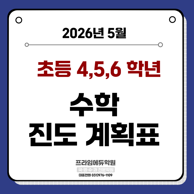 안녕하세요. 프라임에듀입니다. 프라임에듀 초등부 수학 정규반 5월 진도 계획을 안내드립니다. 초등 수학은 단순히 문제를 많이 푸는 것보다 개념을 정확히 이해하고 다양한 유형을 경험하는 것이 중요합니다. 프라임에듀에서는 학생들의 수준과 학교 진도에 맞춰 개별 진도 방식으로 수업을 진행하고 있습니다. 또한 매달 월말 평가를 통해 학습 내용을 점검하고 부족한 부분을 보완합니다. 프라임에듀에서는 ✔ 개념 이해 ✔ 유형 문제 풀이 ✔ 학교 진도 맞춤 학습 ✔ 월말 평가를 통한 학습 점검 을 통해 학생들이 수학 실력을 탄탄하게 키울 수 있도록 지도하고 있습니다. 학생 한 명 한 명의 학습 상황을 고려하여 맞춤형 수업을 진행하겠....... <img src="https://blogthumb.pstatic.net/MjAyNjA0MjJfMTM4/MDAxNzc2ODYxMjQ2OTg0.ZWt6eKAMPfbcwh3lgK5ZcrvRmzU7hqDCL9OGCDYamY0g.r-amItt2mh9hDnfbQ429_fBrBswcpHl6FOzj0JeAU-Ug.PNG/%C3%CA%BC%F6.png?type=s3" />