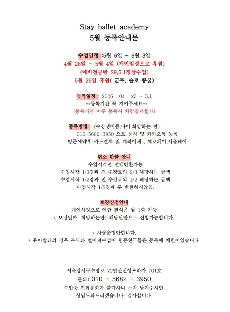 스테이발레학원 5월등록 안내문