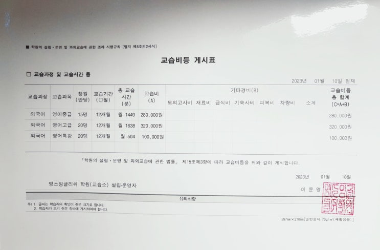 [학원 교습비 등 관련 규정에 따른 표시 사항]