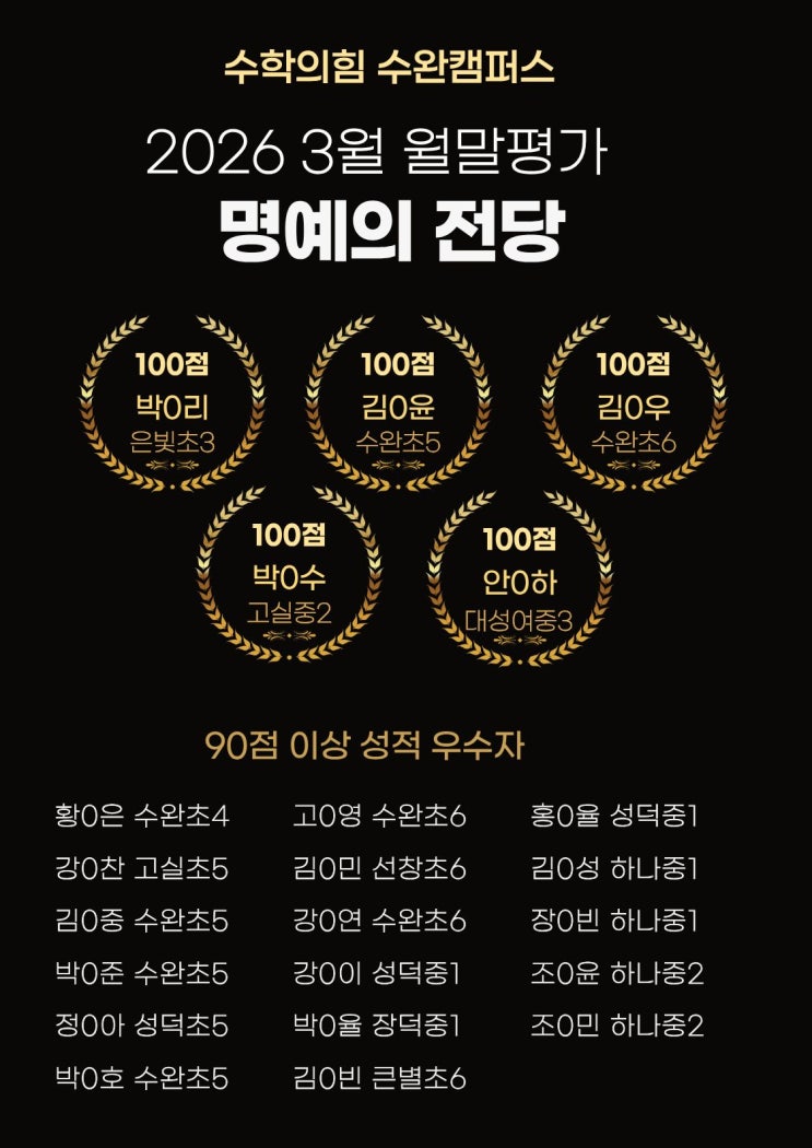 안녕하세요, 학원 선호도 1위 '마음에 기술을 더하다' 초격차 수학의힘 수완 캠퍼스입니다. 새 학기가 시작된 3월, 아이들의 한 달간의 학습을 점검하는 월말평가가 진행되었습니다. 3월은 특히 새로운 학년, 새로운 환경에 적응하는 시기이기에 아이들에게도, 학부모님들께도 더욱 의미 있는 한 달이었을 것입니다. 이러한 시기에 진행된 월말평가는 단순한 시험을 넘어 아이들의 현재 학습 상태와 적응 과정을 함께 확인할 수 있는 중요한 시간이었습니다. 이번 월말평가는 선행 1시간, 현행 1시간으로 구성하여 아이들이 배우고 있는 내용과 앞으로 나아갈 방향을 함께 점검했습니다. 시험 이후에는 개별 분석을 통해 각 학생의 강....... <img src="https://blogthumb.pstatic.net/MjAyNjA0MDhfMjky/MDAxNzc1NjA3NjEwMzM0.6wt1-Gv6OALVtjREt4KyTobIo6Q6jpdFZkMjfTNgPLEg.T6YseWePeKsBNSA9b3okPGYDJvngWmtIINCTF0mmILYg.JPEG/3%BF%F9%B8%ED%BF%B9%C0%C7%C0%FC%B4%E7.jpg?type=s3" />