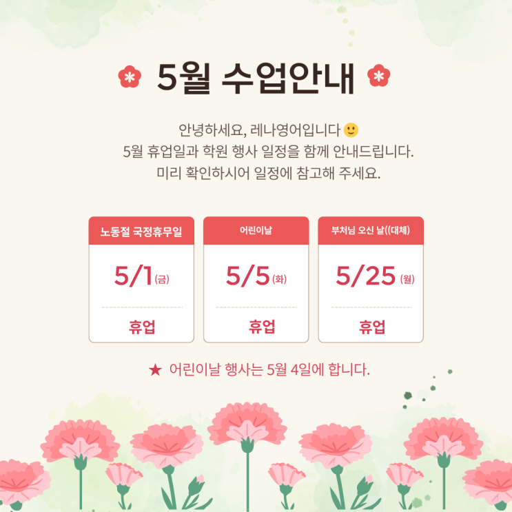 안녕하세요, 레나영어입니다. 따뜻한 햇살과 함께 가족의 소중함을 다시 한번 느끼게 되는 5월, 가정의 달이 찾아왔습니다. 아이들이 건강하게 성장하기까지는 가정에서의 따뜻한 응원과 격려가 큰 힘이 된다고 생각합니다. 저희 레나영어 역시 그 마음에 함께하며 아이들의 성장을 진심으로 돕고자 노력하고 있습니다. 오늘은 5월을 맞아 수업 일정 및 휴업일, 학원 행사 일정을 안내드립니다. 학부모님들께서는 아래 내용을 참고하시어 일정에 차질 없으시길 바랍니다. 다가오는 5월에도 아이들이 꾸준히 성장할 수 있도록 꼼꼼하게 지도하겠습니다. 항상 믿고 맡겨주셔서 감사드리며, 아이들의 변화로 보답하는 레나영어가 되겠습니다. 감사합....... <img src="https://blogthumb.pstatic.net/MjAyNjA0MTJfMjk3/MDAxNzc2MDAyOTA5OTEw.ntVhSjbqIU2qpMc4p6YmCFfQh1UFBIRRIfcpCCbwEUwg.jWELndpzY6SL68NmAYt-aF5s6wPsESlaz-M2lMCoJh0g.PNG/5%BF%F9_%BC%F6%BE%F7%C0%CF%C1%A4_%BE%C8%B3%BB.png?type=s3" />