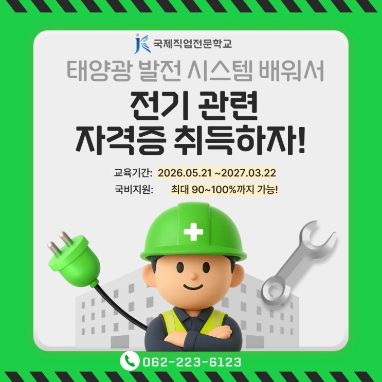 안녕하세요. 국제직업전문학교입니다. . . 요즘 취업이나 이직을 고민하면서 "실무에 바로 써먹을 수 있는 기술"을 배우고 싶다는 분들이 많아진 것 같습니다. 특히 전기. 에너지 분야는 꾸준한 수요가 있는 만큼, 제대로 배워두면 안정적인 커리어를 만들 수 있는 분야입니다. 오늘은 태양에너지(태양광) + 전기 설비 자격증 취득까지 연결되는 교육과 과정에 대해 소개해 드릴게요! 단순 이론뿐만 아니라, 기초부터 실무까지 단계별로 탄탄하게 배우는 커리큘럼이 특징입니다. ✔ 이런 분들에게 추천합니다. · 전기/에너지 분야로 취업을 준비하는 분 ·비전공자지만 기술직으로 전화하고 싶은 분 ·인정적인 직업을 찾고 있는 분 ·태....... <img src="https://blogthumb.pstatic.net/MjAyNjA0MTdfNjkg/MDAxNzc2NDEwMDIyMTYz.8ciGLbYvgrNFD3m3Aru52FXlP-0RfMkoTX-atmeZsL0g.LvLf9RIWKZlK28XphMFpTaFkwgljzJWjbGNV4jULmBMg.JPEG/1.jpg?type=s3" />