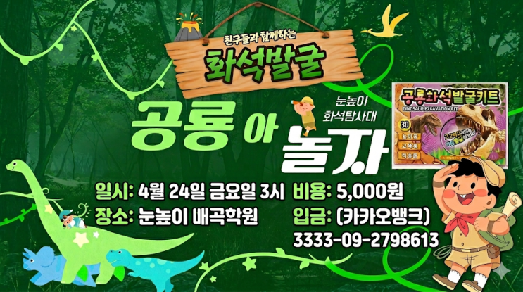아이들이 가장 좋아하는 주제 중 하나, 바로 공룡입니다. 이번 달 눈높이 과학수업에서는 아이들의 호기심을 한껏 자극할 수 있는 ✨ 화석 발굴 체험 활동 ✨을 준비했습니다! 이번 달 과학실험 주제 “화석발굴 키트를 활용한 공룡 탐험” 단순히 보는 수업이 아니라 아이들이 직접 도구를 사용해 화석을 발굴해보는 체험형 과학활동입니다. ✔️ 화석이 만들어지는 과정 이해하기 ✔️ 발굴 도구 사용법 익히기 ✔️ 집중력과 탐구력 향상 ✔️ 공룡에 대한 흥미 유도 아이들은 마치 진짜 고고학자가 된 것처럼 하나하나 조심스럽게 화석을 찾아내며 성취감과 몰입감을 동시에 경험하게 됩니다 이런 아이들에게 추천해요! ✔️....... <img src="https://blogthumb.pstatic.net/MjAyNjA0MjBfMjM2/MDAxNzc2NjcyNjIwOTEz.uCogAr72SlrcdbqFQUAv1YVYuKNHRTtw1fVv7L4WK0kg.cplxkd4s7nzXiVSfcyroogh1tNsP9hbbIbBYgNpf6pgg.PNG/image.png?type=s3" />