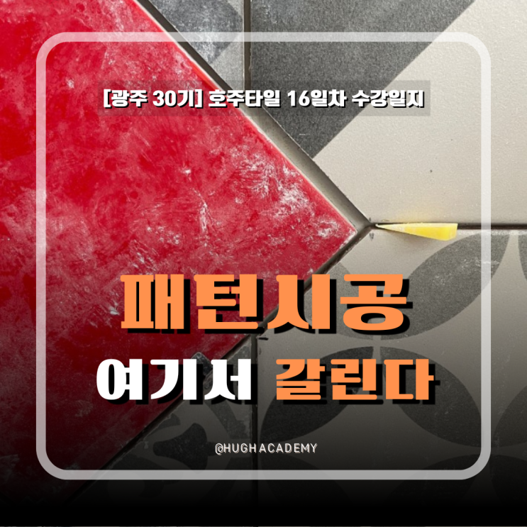 안녕하세요 휴건축기술학원입니다. 광주에서 진행되는 호주타일 과정 30기 16일차 수업에서는 다양한 패턴 시공과 함께 디테일 작업을 중심으로 실습이 진행되었습니다. 단순히 타일을 붙이는 작업을 넘어, 패턴 구조와 커팅 방식, 줄눈 정리까지 전반적인 흐름을 이해하는 과정이었습니다. 특히 이번에는 브릭패턴, 헤링본 계열과 함께 다이아몬드 패턴 실습이 핵심으로 이론수업이 진행되었으며 같은 호주타일 작업이라도 기본이 쌓이면서 작은 차이가 결과에서 크게 드러난다는 점을 확인할 수 있었습니다. 눈에 보이는 완성도보다 과정에서의 정확도가 중요하다는 점을 체감한 하루였습니다. 15일차 수강일지는 아래 링크를 통해 이어서 확인....... <img src="https://blogthumb.pstatic.net/MjAyNjA0MjJfMyAg/MDAxNzc2ODIyNjM5OTQ0.npEulKSPeOi5d6I9E8JdwVm02-PIGohVnwZgKJVuKdQg.bKYn9EEnidY6kHCUc0lEGD0qN9O4oJ3inW49A5Ar_-cg.PNG/%BC%F6%B0%AD%BB%FD%C0%CF%C1%F6.png?type=s3" />
