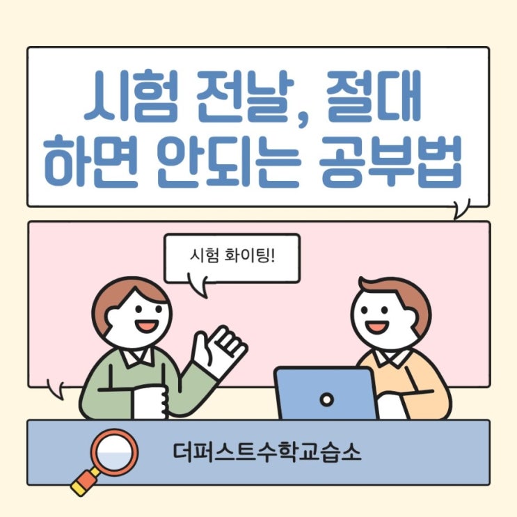 안녕하세요. 복수동 학원가에 위치한 더퍼스트수학교습소입니다. 요즘 중간고사를 앞두고 시험준비에 한창인데요, 오늘은 시험 전날, 절대 하면 안되는 공부법에 대해서 포스팅해보겠습니다. 시험 전날이 되면 마음이 급해지죠. “이거라도 더 보면 점수 오르지 않을까?” 하는 생각, 누구나 합니다. 하지만 방향을 잘못 잡으면 오히려 점수가 떨어질 수도 있습니다. 오늘은 중·고등학생들이 시험 전날 자주 하는 실수와, 꼭 피해야 할 공부법을 알려드릴게요. 1. 새로운 개념 처음 보기 시험 전날 갑자기 새로운 단원이나 어려운 개념을 시작하는 경우가 많습니다. 결과는 대부분 이해도 애매하고, 기존에 알던 내용까지 헷갈립니다. 특히 수학....... <img src="https://blogthumb.pstatic.net/MjAyNjA0MjJfMTUx/MDAxNzc2ODQ4MTY4NjI1.0jF3Wn3nZ9TFfTf7-Vg80cVNY-WRRAcfKktdIQv8Q9Ig.PwE9Oq7HUmlxtfunqQ_kjszVbLWkmFravBJfMA0Kptgg.JPEG/900_%C1%A6%B8%F1%C0%BB_%C0%D4%B7%C2%C7%D8%C1%D6%BC%BC%BF%E4.%287%29.jpg?type=s3" />