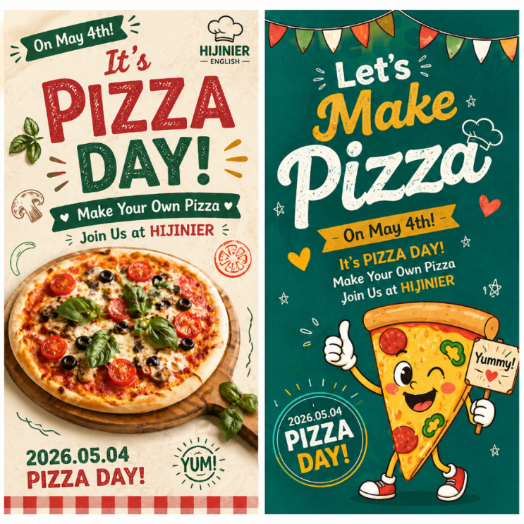 Video HIJINI PIZZA DAY 영상 ⬆️⬆️⬆️ 피자만들기 이벤트 5/4 Event Day (어린이날 기념 이벤트 안내) ★ 이벤트 내용 : 나만의 피자 만들기 활동 (Delicious Pizza VS Strange Pizza ) ★ 이벤트 대상: 초등부 ※ 중•고등부는 정규수업 진행합니다. 기본 재료는 학원에서 제공합니다. 추가 재료는 팀별 혹은 개별로 준비하여 더욱 창의적인 활동이 이루어질 수 있도록 합니다. 준비물 안내 추가 피자 재료 (개별 또는 팀별 준비) 음료수 학원 제공 물품 피자도우, 토마토 소스, 피자 치즈, 옥수수 콘 이번 프로그램은 영어 쿠킹 클래스 형태의 체험형 수업으로 진행됩니다. 학생들은 요리 과정 속에서 자연....... <img src="https://blogthumb.pstatic.net/MjAyNjA0MzBfMTEy/MDAxNzc3NDc1NzU1NjI4.tUdorPN_kjRiy-ATzzFHV9zCQBwyvU5ZfX4psZgby00g.KEH0qbW-UUCygBJTVL2P1XALwYiNrCXt0tTcAEUvG5wg.PNG/900_file_000000003c1c7209ba82ff7693d9d3cf.png?type=s3" />
