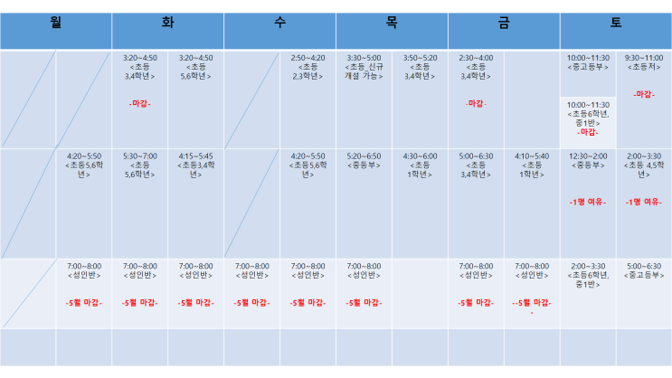 #5월시간표#2026년5월#벌써초여름#온에어스피치 2026년 5월 온에어스피치 시간표 안내 안녕하세요. 세종시 새롬동에 위치한 스피치 전문 교육원 온에어스피치 입니다 :-) 벌써 한낮에는 여름의 기운이 느껴지는 요즘입니다. 올 여름은 얼마나 더울지 벌써부터 걱정이 되는데요. 짧아서 더 소중한 봄 그리고 초여름 제철을 만끽하며 행복한 5월 되시길 바랍니다. 온에어스피치 5월 시간표 안내합니다. · 한 반 정원은 5~6명입니다. · 수업의 질과 효율을 고려하여 한 클래스 당 정원을 최대 6명 이하로만 유지하고 있습니다. · 주 1회, 월 4회 수준별, 학년별 맞춤 수업입니다. · 자세한 문의는 전화 및 네이버 톡톡으로 주세요. · 수업 중 상담 불....... <img src="https://blogthumb.pstatic.net/MjAyNjA0MjBfMTkw/MDAxNzc2NjUxOTg1MjA4.EJoqFgloGLxDfM28OWxpjDlke2AFyQJCQR11GEtAv8Qg.-qnS7ROK40u8Hw4Ll4BGf6ykMaH4FdDhDlF7zasKaRkg.PNG/2026%B3%E2_5%BF%F9_%BD%C3%B0%A3%C7%A5.png?type=s3" />