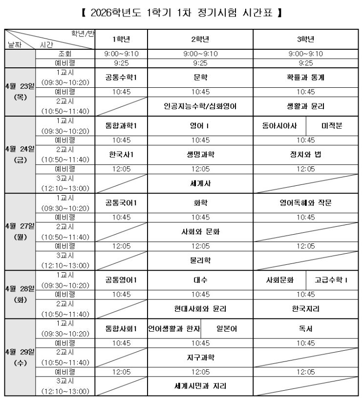 안녕하세요!! 민락동수학학원 수앤아이수학학원입니다!! 오늘은 2026학년도 1학기 중간고사 학교별 시험 일정에 대해서 알아보도록 하겠습니다!! < 영석고등학교 > < 송현고등학교 > < 부용고등학교 > < 의정부여자고등학교 > < 효자고등학교 > < 경민고등학교 > < 송양고등학교 > < 발곡고등학교 > < 호원고등학교 > 상우고등학교 광동고등학교 의정부고등학교는 아직 세부일정이 올라오지 않아서 추후 업데이트 예정입니다. 1학기 중간고사를 잘 마무리 할 수 있도록 화이팅 입니다!! 습관으로 시작해서 대학입시까지 책임지는, 학생들이 학원가는 것을 즐거워하는 민락동 중고등 수학....... <img src="https://blogthumb.pstatic.net/MjAyNjA0MTVfMTQw/MDAxNzc2MjQ2MDI3ODE2.nOIGfbAzlcsbi8yvCeKzCfsEswUU0qj6sCBWugHgy7wg.JzqnUU0Ty6IfOX-4rn4qPATOq0Hg4tudmGwjvEsJr2Qg.JPEG/%BF%B5%BC%AE%B0%ED_%C1%DF%B0%A3%B0%ED%BB%E7_%BD%C3%B0%A3%C7%A5.jpg?type=s3" />