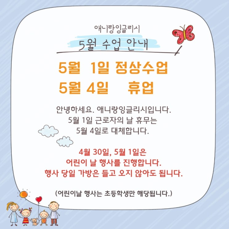 4월 30일(목) 5월 1일(금) 초등 : 어린이날 행사 중등 : 지필평가 분석 5월 4일 휴업 (근로자의 날 대체) *일부 학급 수업 (개별 안내 완료) 잠시 멈추었던 신입생 등록을 다시 시작합니다. 상담 및 등록 안내는 문자로 부탁드립니다. 010-2089-5424 <img src="https://blogthumb.pstatic.net/MjAyNjA0MThfODQg/MDAxNzc2NDg0NjQyMzQ2.pnOdraITAckYOtEacIT2MOnm6Vc3cds7Q47z6vNLJVIg.syuY9BGyQtgCcg5U5cegKUJ-lJv-U4Ab8jcUM3HZF0Ug.JPEG/IMG%A3%DF3503.jpg?type=s3" />