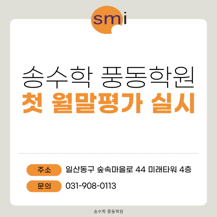 [풍동 수학학원] 2026학년도 1학기 첫 월말 평가를 마쳤습니다! 안녕하세요, 송수학 풍동학원입니다 중2·중3 학생들은 지금 중간고사 대비로 한창 바쁜 시간을 보내고 있는데요, 그렇다면 아직 학교 시험이 없는 초등부와 중학교 1학년 학생들의 실력은 어떻게 점검하고 있을까요? 올해 첫 번째 월말 평가를 실시했습니다! 새 학기 첫 평가인 만큼 아이들도, 저희도 더욱 마음을 단단히 잡고 임했습니다. <초등부, 중등부 '월말평가' 안내> https://blog.naver.com/songmath_/224231537812 ✅ 학기 시작 한 달, 지금이 바로 점검 타이밍! 새 학기가 시작되면 새로운 단원, 새로운 개념들이 쏟아집니다. 첫 월말평....... <img src="https://blogthumb.pstatic.net/MjAyNjA0MDhfMjM4/MDAxNzc1NjE4NjI2MjYy.ivGI32nw--DdCz6RPdU5I5H2nGt8iwXySKdsUYXhdWcg.Nw1whO4U7h8M6T20wOxKE31s8ZSWFoJpbH3Wa1wfsvcg.PNG/%C1%A6%B8%F1%C0%BB_%C0%D4%B7%C2%C7%D8%C1%D6%BC%BC%BF%E4._%281%29.png?type=s3" />