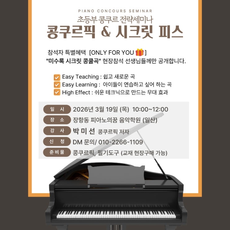 콩쿨때 하게되는 고민 중 하나는 아이를 어떻게 더 돋보이게 할 수 있을까? 라는 고민도 빠질 수 없죠~ 그래서 새로운 곡들을 꾸준히 찾게되고 많은 곡들을 준비해둬야 아이들마다 다양한 특성에 잘 맞는 곡들을 제시해 줄 수도 있구요~ 그래서 피아노의 꿈에서는 늘 신간을 놓치지않고 세미나에 참여하거나 저희 학원에서 강사님을 직접모시고 세미나를 진행하기도 합니다 이번에는 정말 따끈한 신간으로 26년 2월에 나온 교재인데 온라인소개세미나를 들어보았습니다 <콩쿠르픽>이라는 교재인데 연주해보니 콩쿨뿐만아니라 기초 막바지거나 중급 시작하는 단계에서부터 연주곡집으로도 넘 좋을 것 같더라구요~ 그래서 편저자님을 직접 모....... <img src="https://blogthumb.pstatic.net/MjAyNjA0MTZfMTU4/MDAxNzc2MjcwMTU2MzQ3.akJh5yllXYx7uoO79x-it7A0-SmH50_XaygkSjyMlXUg.0xBxOcdEl1tB8fW3cE3dHM8qbX61CdtpsJV-s1kJx58g.JPEG/900_1771576288433.jpg?type=s3" />