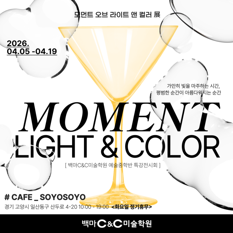 안녕하세요 백마C&C미술학원 예술중학반입니다.^^ 오늘 소개해 드릴 소식은 예술중학반 친구들이 방학기간 진행한 감성 회화 실기 수업으로 완성한 작품들을 가지고 백마학원가와 밤리단길에서 "수플레 맛집" "분위기 맛집"으로 사랑받는 카페 소요소요와 함께 작품 전시회를 진행해 보았습니다~^^ 이전 게시글에서도 감성 회화 실기 작품에 대한 수업 소개 글을 올리었는데요~ 못 보신 분들이 있다면 해당 게시글 한번 봐주세요~^^ 멋지게 완성한 작품들을 가지고 카페 소요소요로 향했어요~ㅎㅎ 아이들의 작품을 어디에 어떻게 배치할지 미리 사전답사를 가서 세워진 계획대로 전시 디피를 진행하였는데요~ 백마C&....... <img src="https://blogthumb.pstatic.net/MjAyNjA0MTdfMjAy/MDAxNzc2NDI2MDcwNDg1.3TReZ0nmJjlaGg9zMaCVSbAJ7Ce50shHbn5YD9E-aScg._zRcLbJp9LNg4hgfTvlrJrSfDFuhBmjP6tEDb35IAocg.PNG/KakaoTalk_20260324_174552832.png?type=s3" />