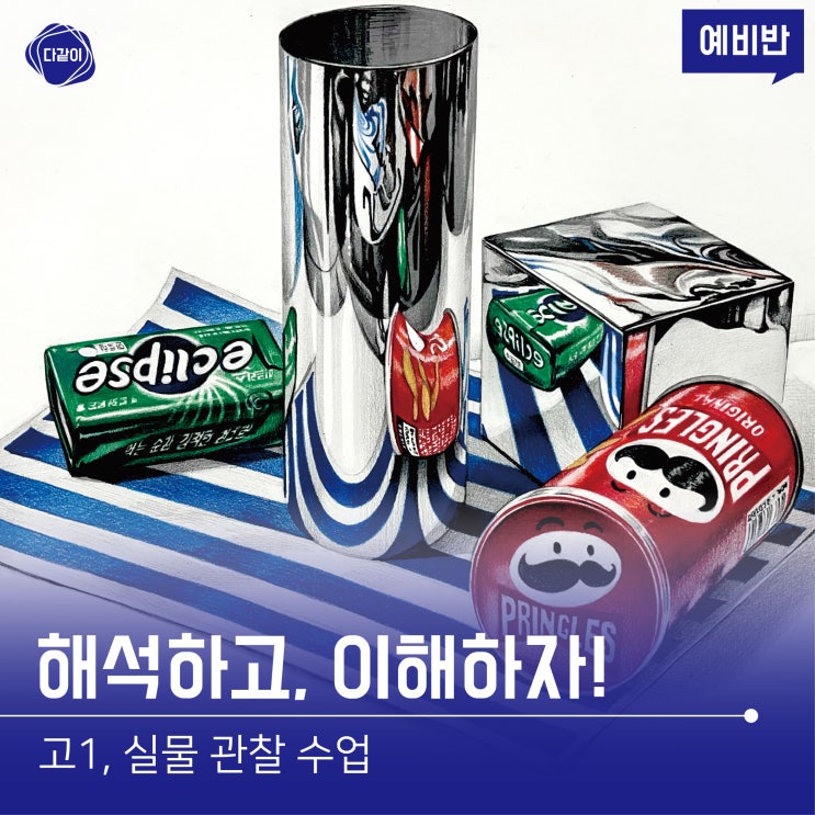 안녕하세요 다산역 입시미술학원 다같이 고1 예비반입니다. 다산 다같이미술학원 예비반에서는 3,4월간 금속과 유리재질에 대한 수업을 진행했습니다. 일반적인 재질과 달리, 빛이 비치고 주변이 반사되는 금속(반사체)과 유리(투명체) 재질은 학생들이 특히 어려워 하는데요, 반사와 굴절같은 특성 때문에 미술실기를 막 배우기 시작한 학생들에게는 다소 난해하게 느껴질 수 있는 재질이죠. 재질에 대한 해석과 이해를 바탕으로 고1 예비반에서는 저학년부터 다양한 재료를 경험해 표현의 폭을 넓히고, 재료에 대한 이해를 깊게 만들기 위해 건식재료 수업을 함께 진행하고 있습니다. 서울대, 한예종, 국민대 등 최상위권 대학의 실기에서 활용....... <img src="https://blogthumb.pstatic.net/MjAyNjA0MTlfMzgg/MDAxNzc2NjAzMjc4MzAx.DsQi8MOvx8HcZ2bfRF_l33JaSQJOFC2lnl28ktPOZMcg.np5o8R-xuYEKtlL0Tpi06lnAaqW0hqk7TbeFmXX-Ru8g.JPEG/%B0%ED1_%BA%ED%B7%CE%B1%D7_%B4%EB%C7%A5%C0%CC%B9%CC%C1%F6.jpg?type=s3" />