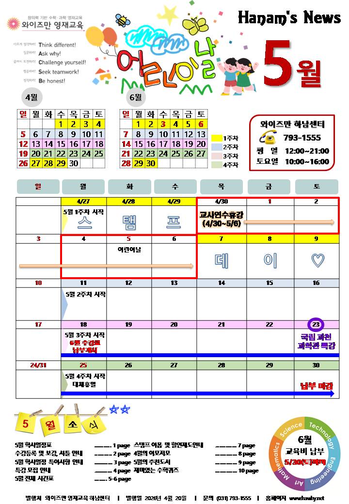[와이즈만 하남센터] 5월 소식지 / 국립 과천 과학관 특강 / HME 해법수학 학력평가 특강 / 2027학년도 영재원 대비 특별반 모집