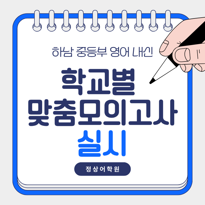 안녕하세요, 중학교 영어시험에서 고득점을 목표로 가르치는 정상어학원 입니다^^ 빠른 학교는 벌써 다음 주 학교 시험이 시작됩니다. 하남정상어학원, 미사정상어학원에서는 우리 중2, 중3 학생들의 2026년 올해 첫 학교시험 영어 지필고사 고득점 획득에 진심을 다하고 있는데요~^^ 첫 시험에서 고득점을 받아봐야 다음 지필고사에서도 고득점을 목표로 하려는 의지와 자신감이 생기기 때문입니다 ♥ 또, 지필고사를 잘 본 학생들은 중간고사 끝나고 실시하는 영어 수행평가에서도 조금이라도 점수를 안 깎이기 위해 부단히 노력하는 모습을 보여주기 때문에, 모든 시험 안 중요한 시험이 없지만 매해 처음 보는 시험을 저희는 가장 신경쓰고 있....... <img src="https://blogthumb.pstatic.net/MjAyNjA0MjBfNyAg/MDAxNzc2NjcyMDUwNjUy.98j3zhKybsxhzKCRi7v1AGwer0zSoWaTWPmm1TUlPR4g.5zphhujXCkIN4CuEUn3kl-gbnovgA3f_Pgh3hPHX_LYg.PNG/%C1%A6%B8%F1%C0%BB_%C0%D4%B7%C2%C7%D8%C1%D6%BC%BC%BF%E4._%283%29.png?type=s3" />