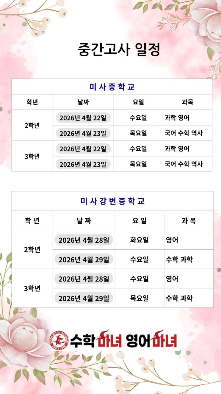 [ 26년 1학기 미사지역 중학교 중간고사일정 ]