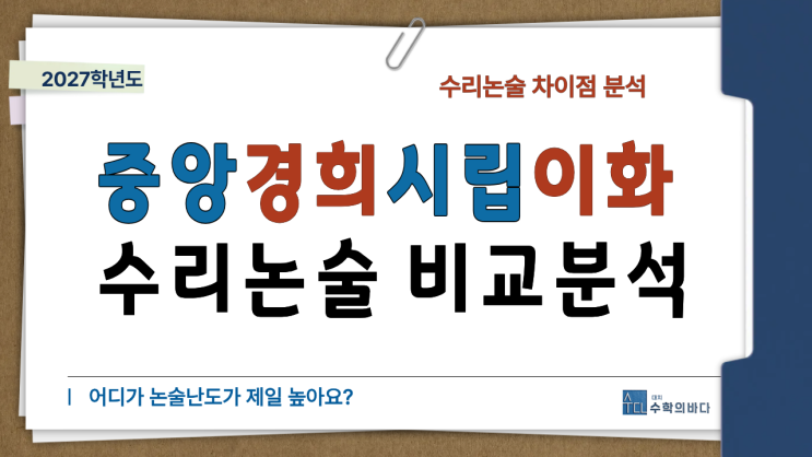 안녕하세요? 수종샘입니다. 오늘은 중앙경희시립이화 수리논술에 대한 비교분석하겠습니다. 한국외국어대학교의 자연계열 논술은 약술형 논술이며, 중앙대,경희대,이화여대,서울시립대에 비해 인지도 ,입결이 모두 상당한 차이로 낮기 때문에 오늘 지면에서는 생략하겠습니다. 또한 중앙,경희,이화의 의학계열은 별도의 지면에서 의학계열끼리 비교분석하겠습니다. 논술전형요약 시험정보 출제형식 + 경향 * 출제 안정성 순으로 배치 경쟁률 + 입결 * 난도는 연세대를 100으로 볼때의 상대적 지표입니다. * 시험의 난도가 각 대학별로 다르므로 논술점수를 비교평가하는 것은 바람직하지 않습니다. * 중앙대 다빈치 캠퍼스는 경쟁률 10:1 ,논술점....... <img src="https://blogthumb.pstatic.net/MjAyNjA0MjhfMTM2/MDAxNzc3MzU3Mzc5MDQy.cgiRkiltn8nCk8DswrNhWetRWJ0H3XGbDQzDLu2bZxEg.LI1fwUJJK7S-qoEMVvxE8LQpFohv8zTsgXHzerR2NHIg.PNG/%C1%A6%B8%F1%C0%BB_%C0%D4%B7%C2%C7%D8%C1%D6%BC%BC%BF%E4._-_2026-04-28T152251.899.png?type=s3" />