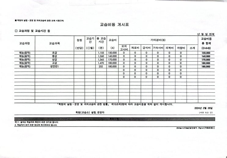 교습비 등 게시표 안내