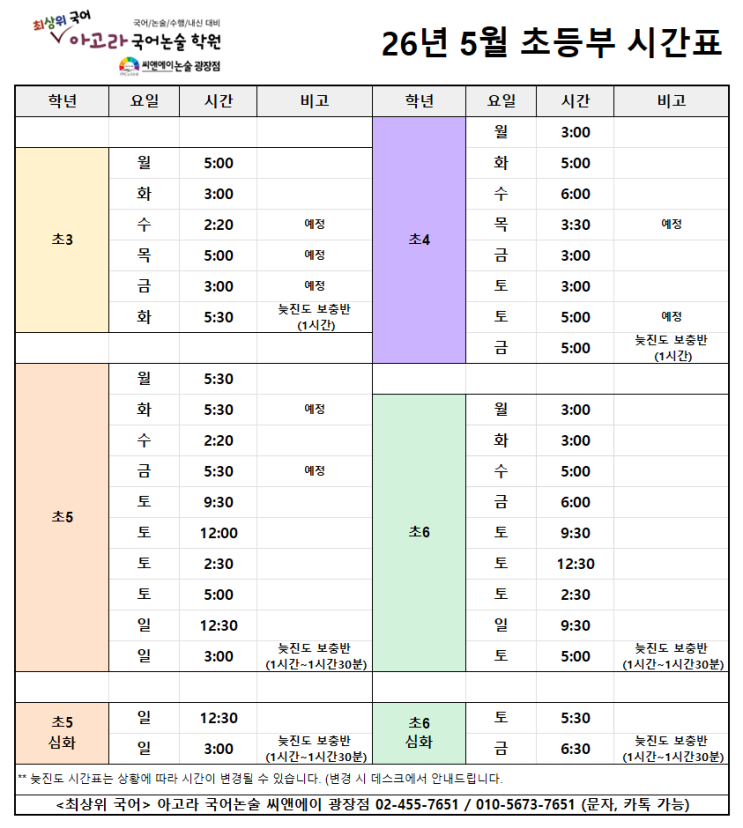 [초등부 5월 시간표 안내] 아고라 국어논술 학원 씨앤에이 광장점