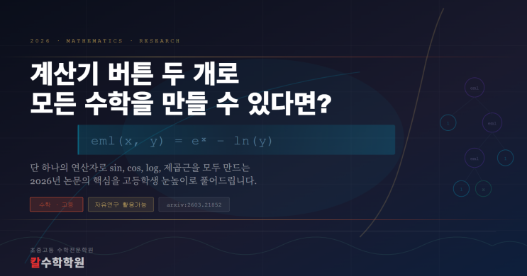 고등학생도 이해하는 2026 수학 논문 — 계산기 버튼 두 개로 모든 수학을? 2026년 3월 23일, 폴란드의 수학자가 발표한 논문 한 편이 수학계와 온라인 커뮤니티에서 조용한 화제가 되고 있습니다. 논문의 제목은 "단 하나의 연산자로 모든 초등함수를". sin, cos, log, 지수함수, 제곱근… 학교에서 각각 다른 개념으로 배워온 이 함수들이 사실 단 하나의 연산의 반복으로 모두 만들어진다는 내용입니다. 수백 년간 수학자들이 당연하게 여겨온 구조를 뒤집은 발견이었고, 디지털 회로의 NAND 게이트처럼 수학에도 단 하나의 '만능 부품'이 존재한다는 사실이 처음으로 증명된 것입니다. 어렵게 들리시나요? 고등학생, 최....... <img src="https://blogthumb.pstatic.net/MjAyNjA0MThfMjk3/MDAxNzc2NDkyODIyNDc4.aEar3sgCs2bRvHT2LlfjSmdgf-IfpOU2SO-UlscBYdMg.5e1ZqG-KMfiK_hlKhnxhnKTsInO1Pranq2RIz_SrTEIg.PNG/thumbnail.png?type=s3" />