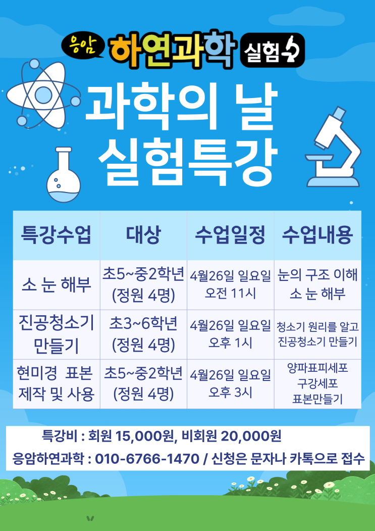 안녕하세요. 응암하연과학 과학쌤입니다.. 너무 오랜만에 글을 올리게 되었어요. 요즘 저는 우리 원에 다니는 친구들과 열심히 실험 수업을 진행하고 있고, 중등 친구들은 중간고사 내신 대비로 바쁜 시간을 보내고 있습니다. 열공중이에요. 오늘은 특별한 소식을 전해드리려고 합니다. 4월은 '과학의 달' 입니다. 그래서 응암하연과학에서도.. 과학의 날을 기념하기 위해서 실험 특강을 준비하게 되었어요. 이번 특강은 평소 수업에서는 쉽게 접하기 어려운 실험들로 구성했습니다. 소눈 해부실험 진공청소기 원리 모터실험 표본제작 및 현미경 관찰 아이들이 직접 만들고, 관찰하고 이해하는 과정 중심의 수업입니다. 아이들....... <img src="https://blogthumb.pstatic.net/MjAyNjA0MTNfMTA4/MDAxNzc2MDQ4MTU0MTIw.iLztySmaf-wkI-SZqat7IqGDpho2CZbek3wY8khAURQg.e4d8AMlgltDULcYa1o78xxNyYqkbywO26cc-gEFUihQg.PNG/%C1%A6%B8%F1%C0%BB_%C0%D4%B7%C2%C7%D8%C1%D6%BC%BC%BF%E4._%284%29.png?type=s3" />