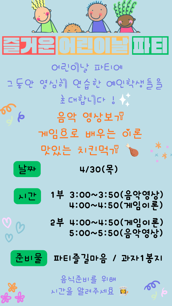 어린이날 파티 초대 예인음악 친구들을 위한 특별한 하루를 준비했어요 음악 영상 감상 게임으로 배우는 즐거운 이론 맛있는 간식까지! 그동안 열심히 연습한 우리 아이들 신나게 즐기는 시간 보내요 ✨ 4/30(목) ⏰ 1부 / 2부 나눠 진행 ✔ 준비물 : 과자 1봉지 + 즐길 마음 아이들이 행복한 추억을 만들 수 있도록 정성껏 준비하겠습니다 #어린이날파티 #신사동음악학원 #서신초음악학원 #키즈파티 #초등학생취미피아노학원 #신사동피아노학원 #신사동바이올린학원 #신사동성악학원 #신사동동요학원 #서신초피아노학원 #서신초바이올린학원 #서신초성악학원 #서신초동요학원 #은평구피아노학원 #....... <img src="https://blogthumb.pstatic.net/MjAyNjA0MThfNTYg/MDAxNzc2NDc2NDA0MDMy.FaoFMdBimp2k59YKKhRQDi_R23_-NLhp8PWYZ58DDY4g.JGyNtTeRKhmnfohZg1opDz6uq7RyZiZUn0ElyVBsUQUg.PNG/550_Colorful_Cute_Happy_World_Children%26rsquo%3Bs_Day_Instagram_Story_20260417_075627.png?type=s3" />